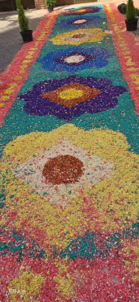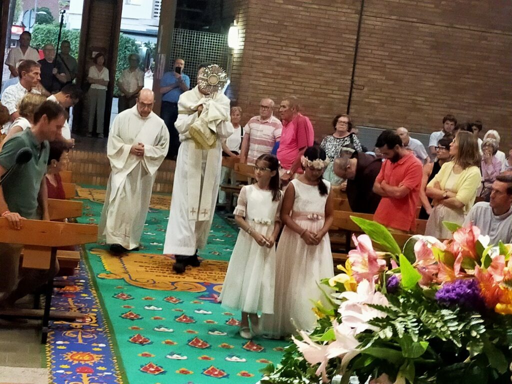 Enguany, la parròquia de la Sagrada Família havia preparat una magnífica decoració floral per al recorregut de la processó de Corpus prevista pel passat diumenge 22 de juny a les 7 de la tarda. Malauradament, una ventada i posterior ruixat va endur-se les catifes i es va haver de traslladar la celebració a l’interior del temple de la Sagrada Família. Hi va haver el temps just perquè Mn. Eduard fes alguna fotografia de la decoració i els altars abans de l’esclafit.