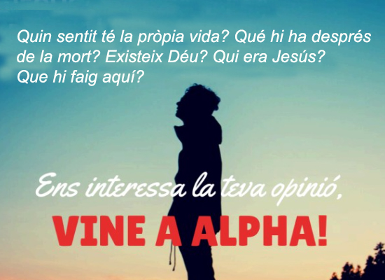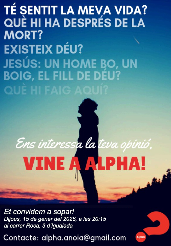 Dirigit als qui es fan preguntes i volen compartir la seva opinió amb altres persones, el grup ALPHA de l’anoia us convida a sopar oferint aquest espai de trobada i debat, de forma gratuita i oberta a tothom.