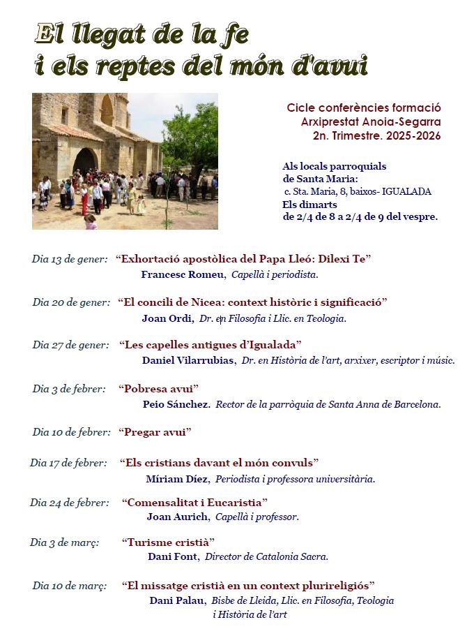 Dia 13 de gener: “Exhortació apostòlica del Papa Lleó: Dilexi Te”, a càrrec de Francesc Romeu, Capellà i periodista. Dia 20 de gener: “El concili de Nicea: context històric i significació”, a càrrec de Joan Ordi, Dr. en Filosofia i Llic. en Teologia. Dia 27 de gener: “Les capelles antigues d’Igualada”, a càrrec de Daniel Vilarrubias, Dr. en Història de l’art, arxiver, escriptor i músic. Dia 3 de febrer: “Pobresa avui”, a càrrec de Peio Sánchez. Rector de la parròquia de Santa Anna de Barcelona. Dia 10 de febrer: “Pregar avui”, encara sense anunciar ponent, que s’anunciarà degudament. Dia 17 de febrer: “Els cristians davant el món convuls”, a càrrec de Míriam Díez, Periodista i professora universitària. Dia 24 de febrer: “Comensalitat i Eucaristia” Joan Aurich, Capellà i professor. Dia 3 de març: “Turisme cristià”, a càrrec de Dani Font, Director de Catalonia Sacra. Dia 10 de març: “El missatge cristià en un context plurireligiós” Dani Palau, Bisbe de Lleida, Llic. en Filosofia, Teologia i Història de l’art.